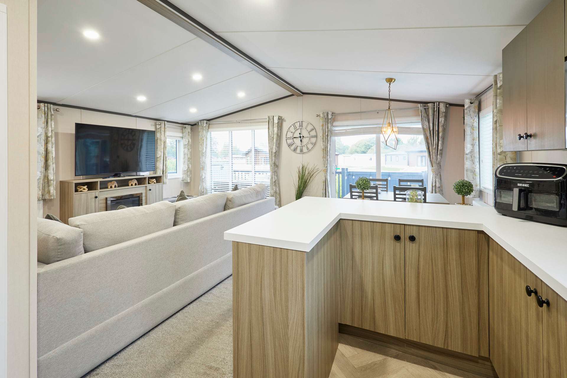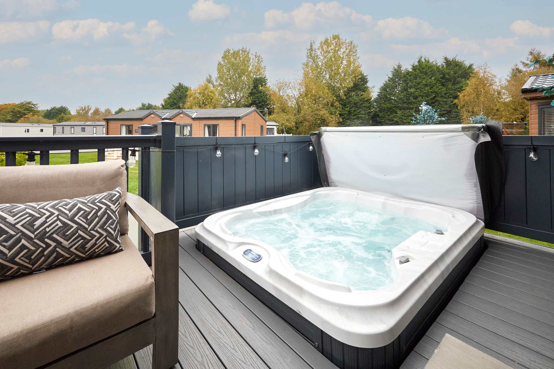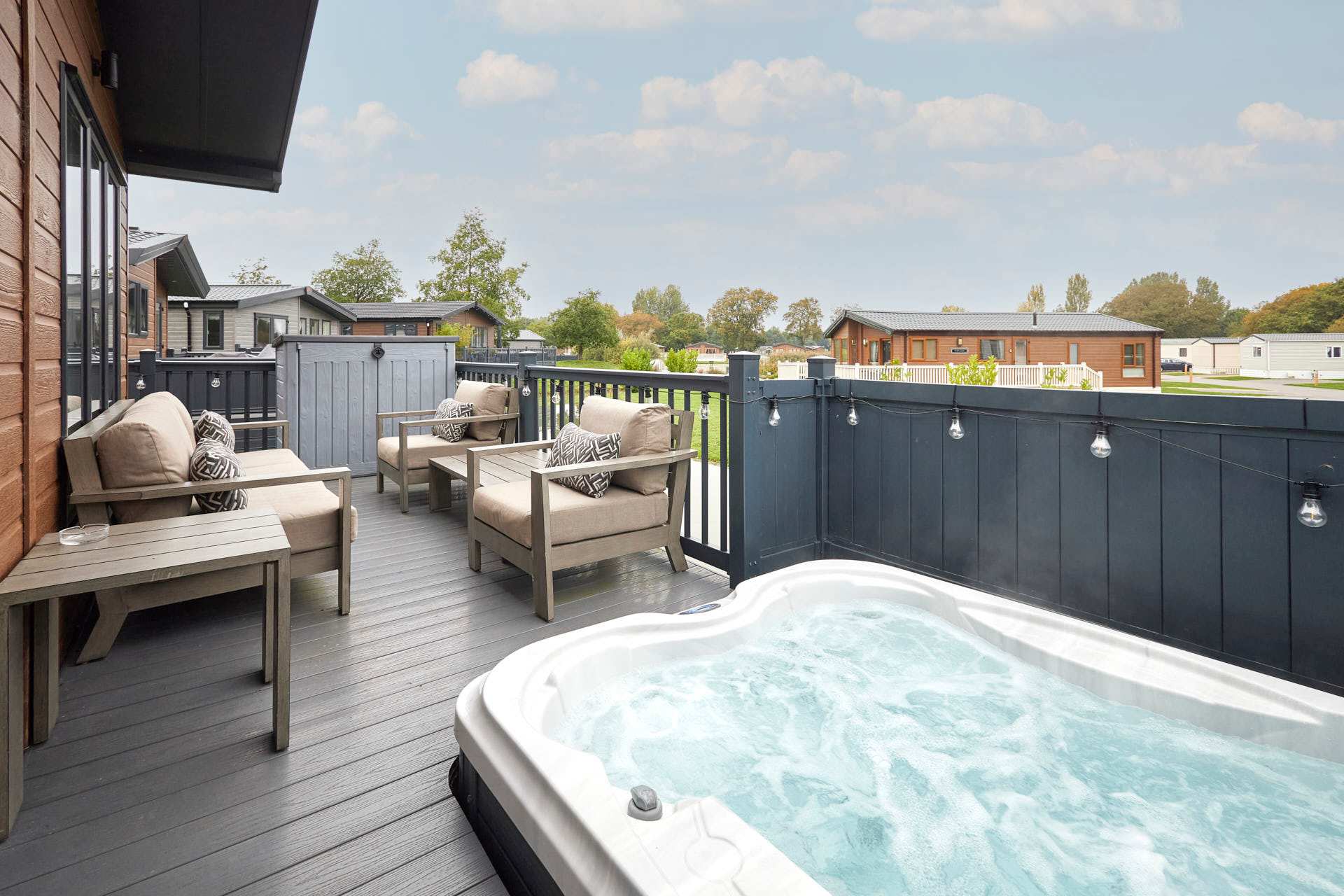 Nestled within the peaceful landscape of Allerthorpe Golf & Country Park, 20 Sandy Lane offers a modern and inviting countryside retreat. This beautifully presented two bedroom, two bathroom lodge sleeps up to six guests and provides the perfect setting for families, couples, or friends to relax and reconnect in nature. The open plan living area is bright and elegant, featuring soft neutral tones and stylish furnishings that create a warm and welcoming atmosphere. The fully equipped kitchen includes everything you need for a self catered stay, while the dining area is ideal for sharing leisurely meals or morning coffee. The lounge offers comfortable seating, a Smart TV, and large patio doors that flood the space with natural light and open out onto the private decking. Outside, the spacious terrace is designed for relaxation and comfort. Enjoy the luxurious hot tub, unwind on the outdoor seating, or simply take in the peaceful park surroundings. Whether it is a sunny afternoon or a quiet evening under the stars, this space is perfect for making memories. The master bedroom features a comfortable double bed and en suite bathroom, while the second bedroom offers twin beds ideal for friends or family. A second modern bathroom adds convenience for larger groups, and the sofa bed in the living area provides additional sleeping space if needed. 20 Sandy Lane is also dog friendly, so your four legged companions are welcome to join you on your countryside escape. With tranquil lakes, walking trails, and golf all within the park, this lodge combines comfort, nature, and relaxation in perfect balance.