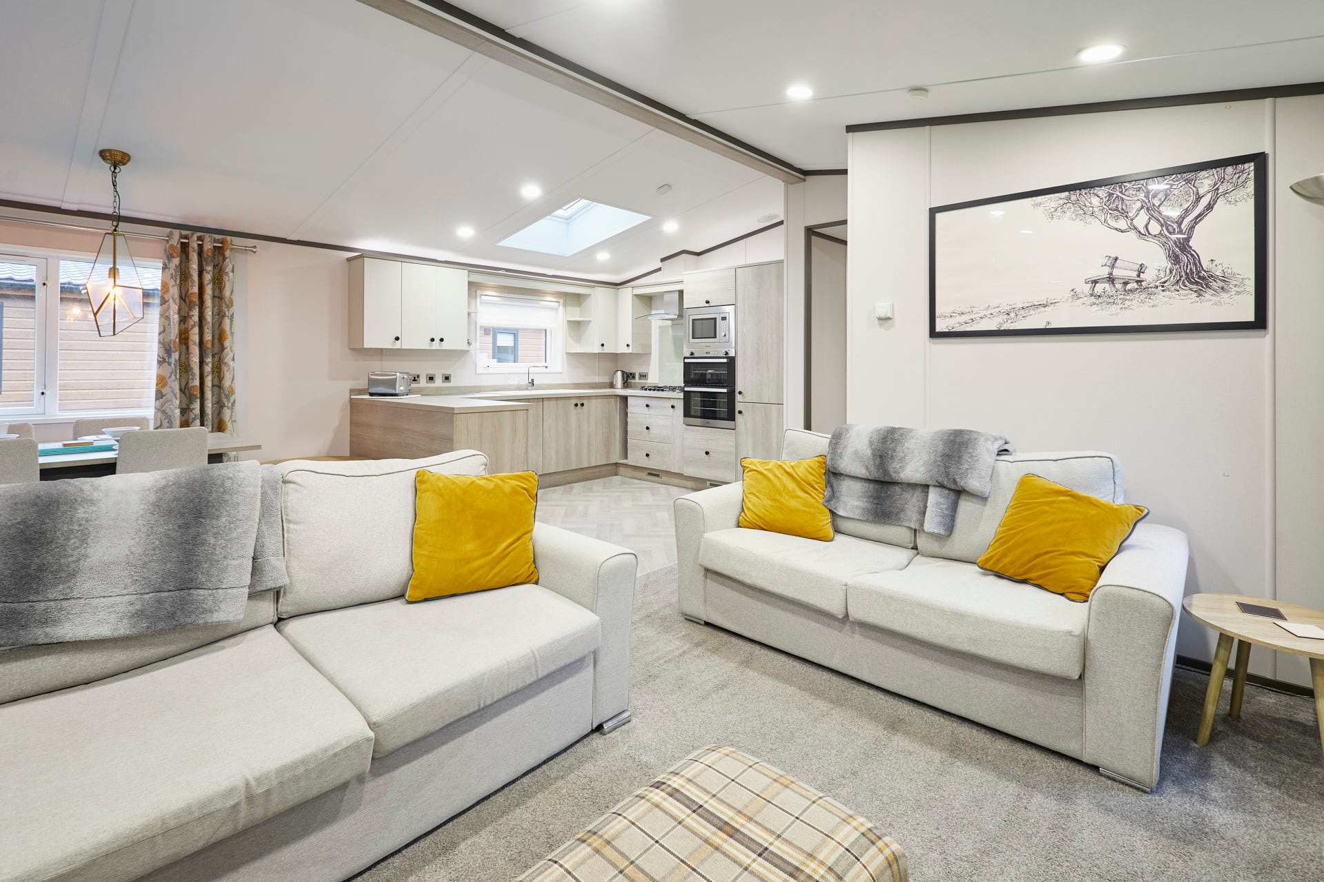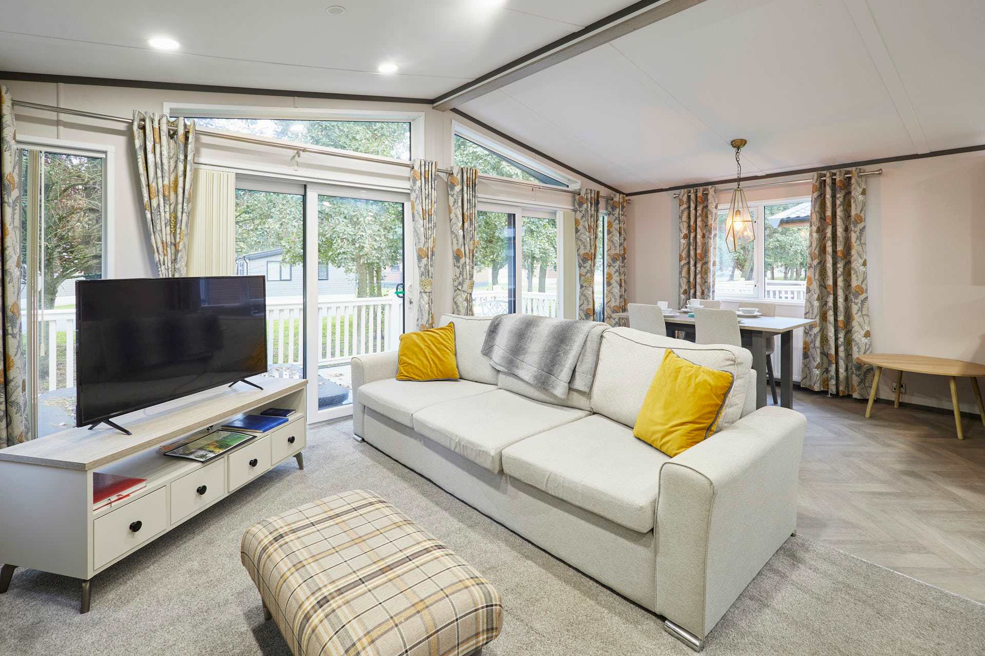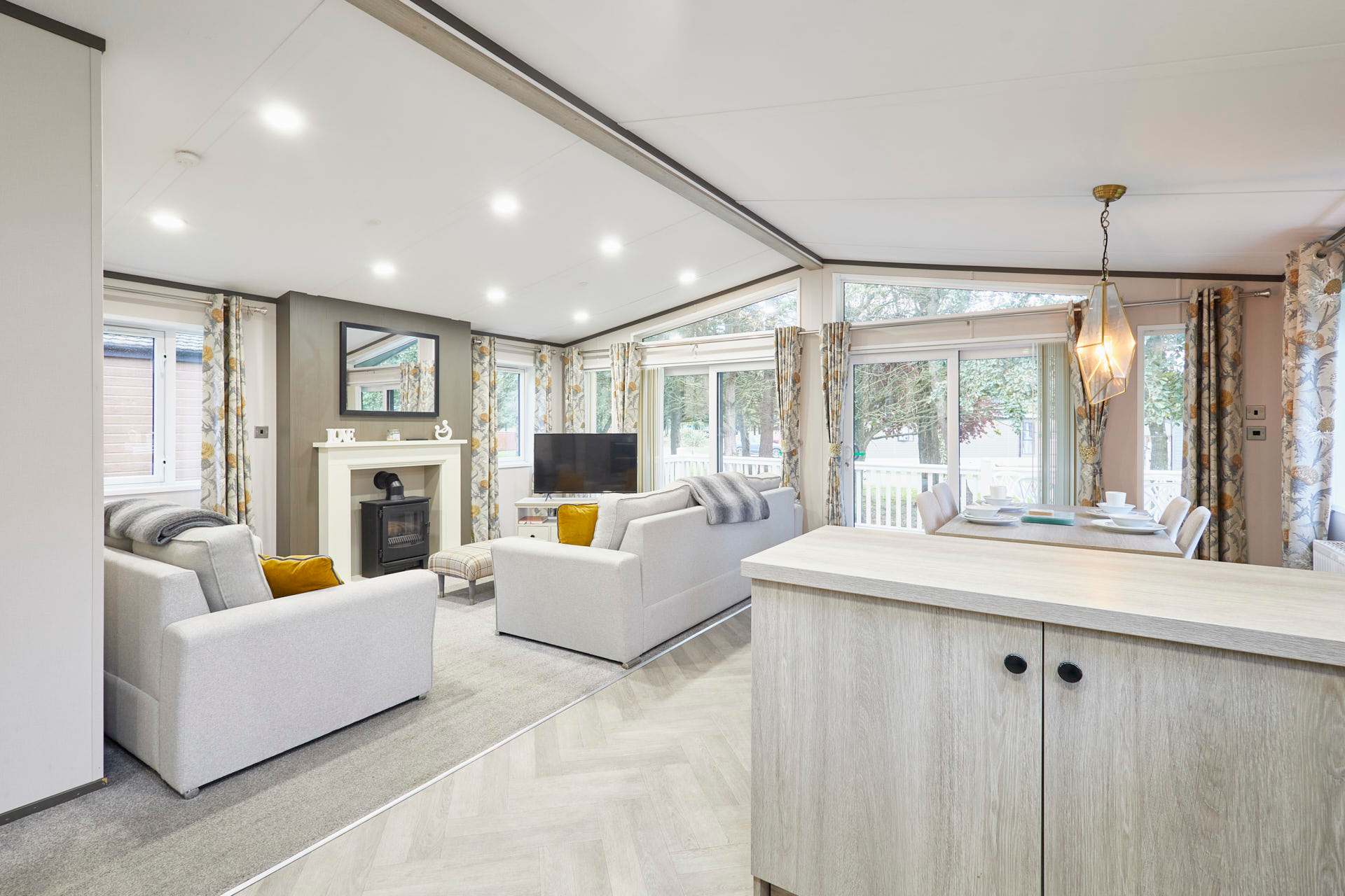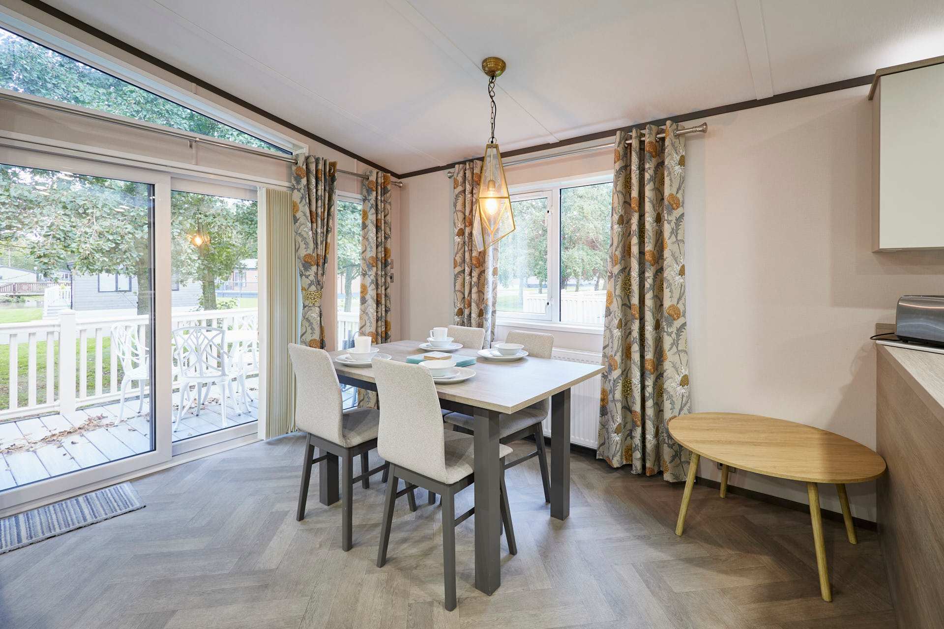Brackencroft Lodge offers a calm, stylish retreat designed for cosy weekends, slow mornings and relaxed time together. With soft, natural tones and comfortable furnishings throughout, the space instantly feels welcoming and restful from the moment you step inside. The open-plan living area brings everyone together with a spacious lounge, inviting dining setup and a fully equipped kitchen complete with a washing machine — perfect for longer stays or family breaks. A feature fireplace adds warmth and charm, creating an ideal setting for peaceful evenings in. The lodge comfortably sleeps six, with a well-appointed double bedroom, a twin room, and a sofa bed in the lounge for additional guests. Two modern bathrooms, including one with a bath, provide convenience and comfort for families and friends sharing the space. Large windows and a peaceful garden outlook allow plenty of natural light to flow through, enhancing the lodge’s calm, restorative atmosphere. Step onto your private decking to enjoy fresh air, outdoor dining or simply unwind with a morning coffee as the day begins. Surrounded by greenery and set within a quiet lodge community, Brackencroft Lodge offers a gentle escape from everyday life — a place to rest, reconnect and enjoy life at an easy pace.