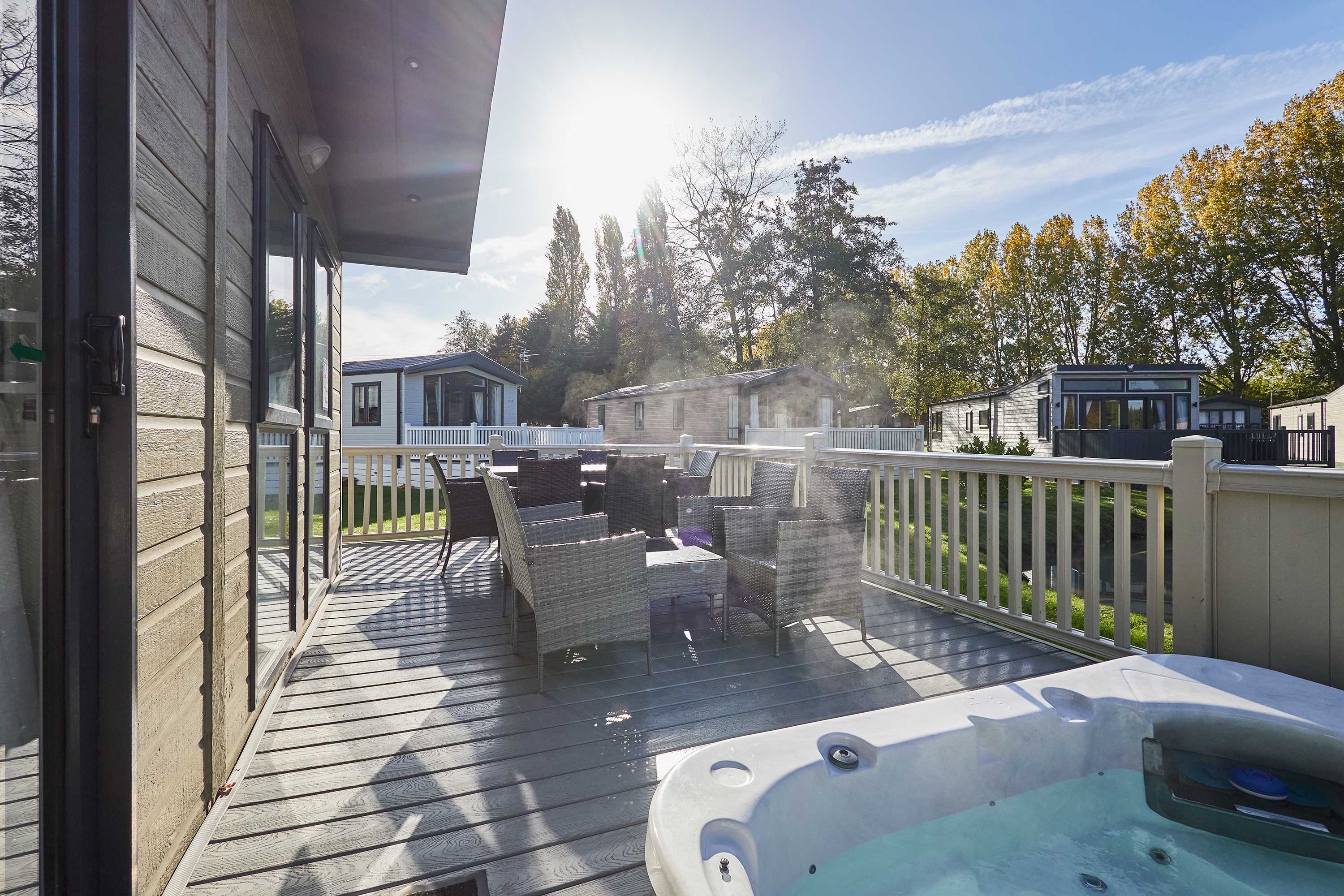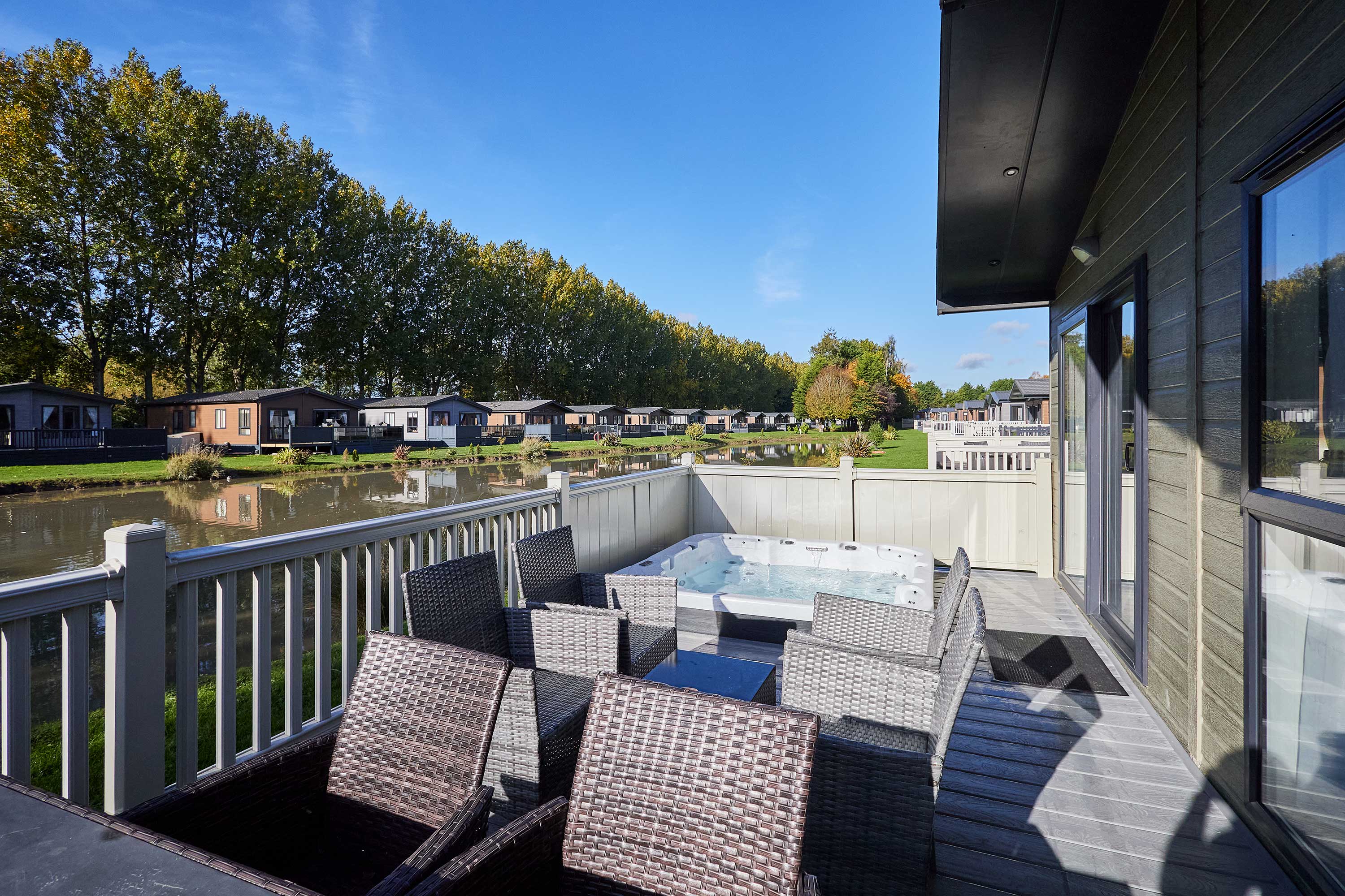 Welcome to Bridgewater Lodge, a thoughtfully designed two bedroom retreat offering comfort, style, and a peaceful setting. Inside, you’ll find a bright and beautifully finished open plan living area. Large windows and soft tones make the space feel calm and uplifting, while contemporary furnishings and thoughtful decor add a warm, homely feel. The living area invites you to unwind, whether you're enjoying a quiet night with a film or planning the next day’s adventures. Step outside to a private decking area complete with comfortable outdoor seating and a hot tub jacuzzi, perfect for soaking under the stars and enjoying peaceful moments surrounded by nature. The fully equipped kitchen has everything needed for relaxed evenings in, including an oven, microwave, kettle, toaster, and a dining table for shared meals and morning coffees. A washing machine, fridge freezer, and generous storage make the lodge ideal for longer stays too. Ideal for families, couples, or small groups, this inviting lodge sleeps up to six guests across one double bedroom, one twin room, and a sofa bed in the airy living space. With two modern bathrooms, including one with a bathtub for long, relaxing soaks, the lodge is created for easy, stress free breaks. Perfectly positioned facing south, the lodge is bathed in natural light from morning to evening, offering a bright, uplifting interior and a sun-drenched terrace for slow, peaceful days outdoors. Bridgewater Lodge sits within a beautiful lodge park setting with a range of lovely on site amenities. Guests can enjoy the picturesque 9 hole golf course, an excellent restaurant, and a charming pizza shack offering casual dining and takeaway. Wander the peaceful grounds and you’ll often spot stunning wildlife, including swans and ducks on the lakes. Bridgewater Lodge is all about comfort, convenience, and enjoying a slower pace. It’s the perfect place to settle in, switch off, and experience cosy lodge park living in a calming countryside environment.