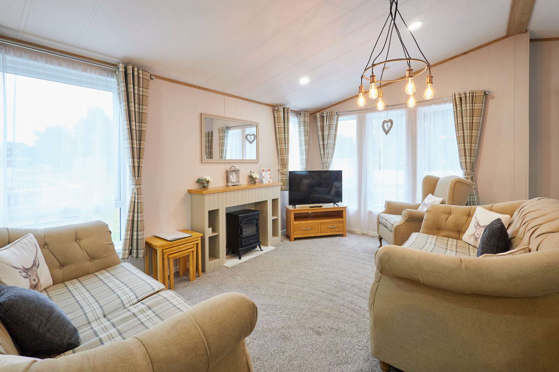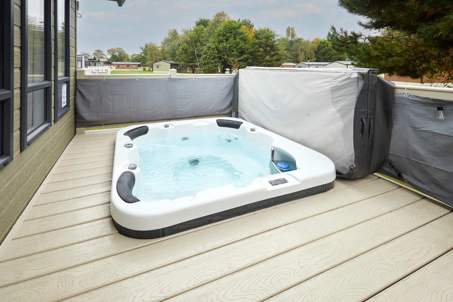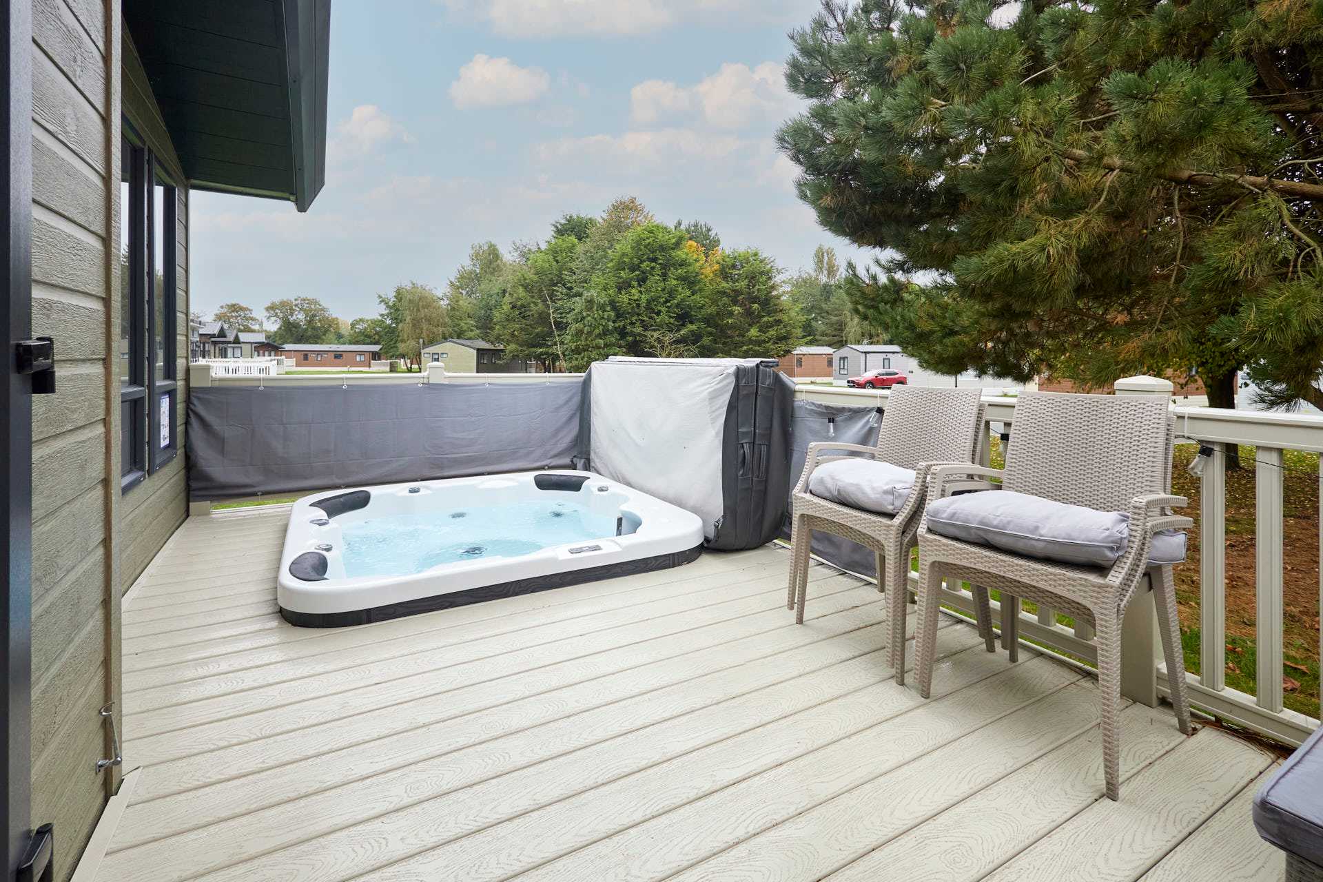Welcome to White Rose Lodge, a beautifully finished two-bedroom retreat nestled within Allerthorpe Golf and Country Park. This inviting lodge combines modern comfort with homely touches, creating the perfect setting for a relaxing escape with family or friends. Sleeping up to six guests, the lodge features a double bedroom, a twin room, and a comfortable sofa bed in the living area. With two bathrooms; one with a bath and one with a shower the,re’s plenty of space for everyone to unwind. The open-plan living space is bright and thoughtfully designed, with a cosy fireplace and soft furnishings that make it easy to settle in. The fully equipped kitchen includes everything you need for a stress-free stay, a stovetop, oven, refrigerator, dishwasher, coffee maker, and dining table, ideal for shared meals or morning coffees. Outside, a private terrace and bubbling hot tub offer the perfect place to relax and take in the peaceful garden views. With a private entrance, washing machine, and pet-friendly policy, White Rose Lodge makes every detail of your stay feel effortless. This is a place to slow down, reconnect, and enjoy the simple pleasures of lodge living, warm, inviting, and designed for comfort.