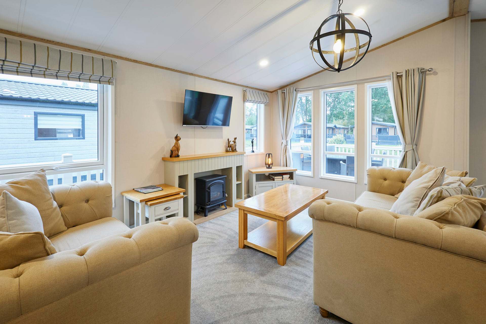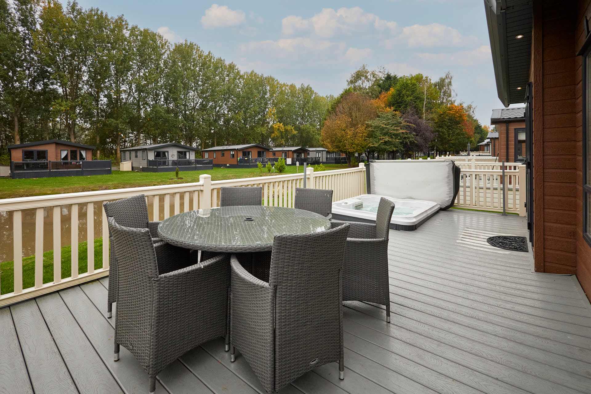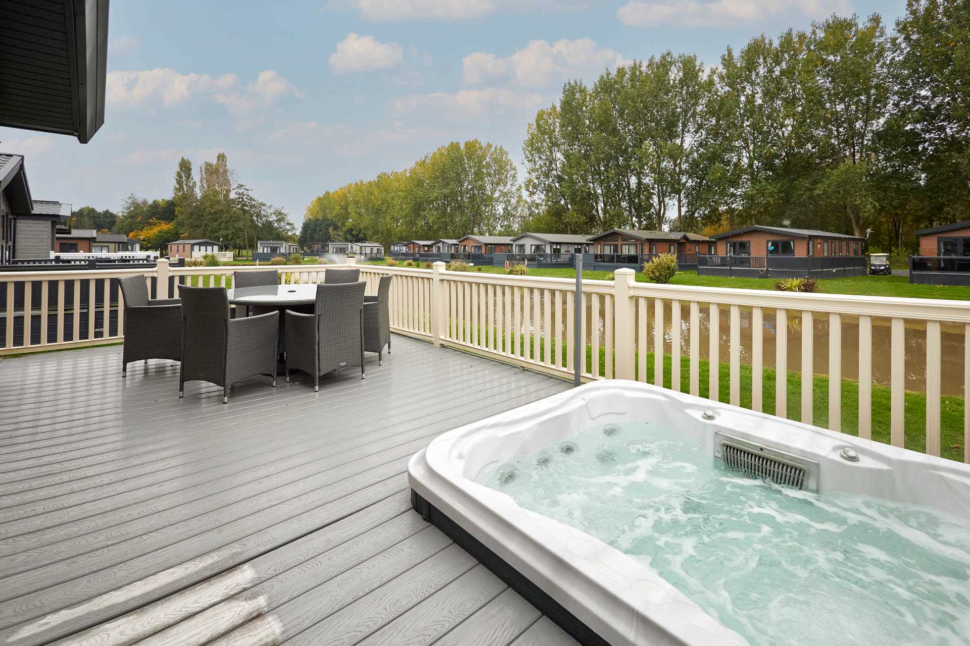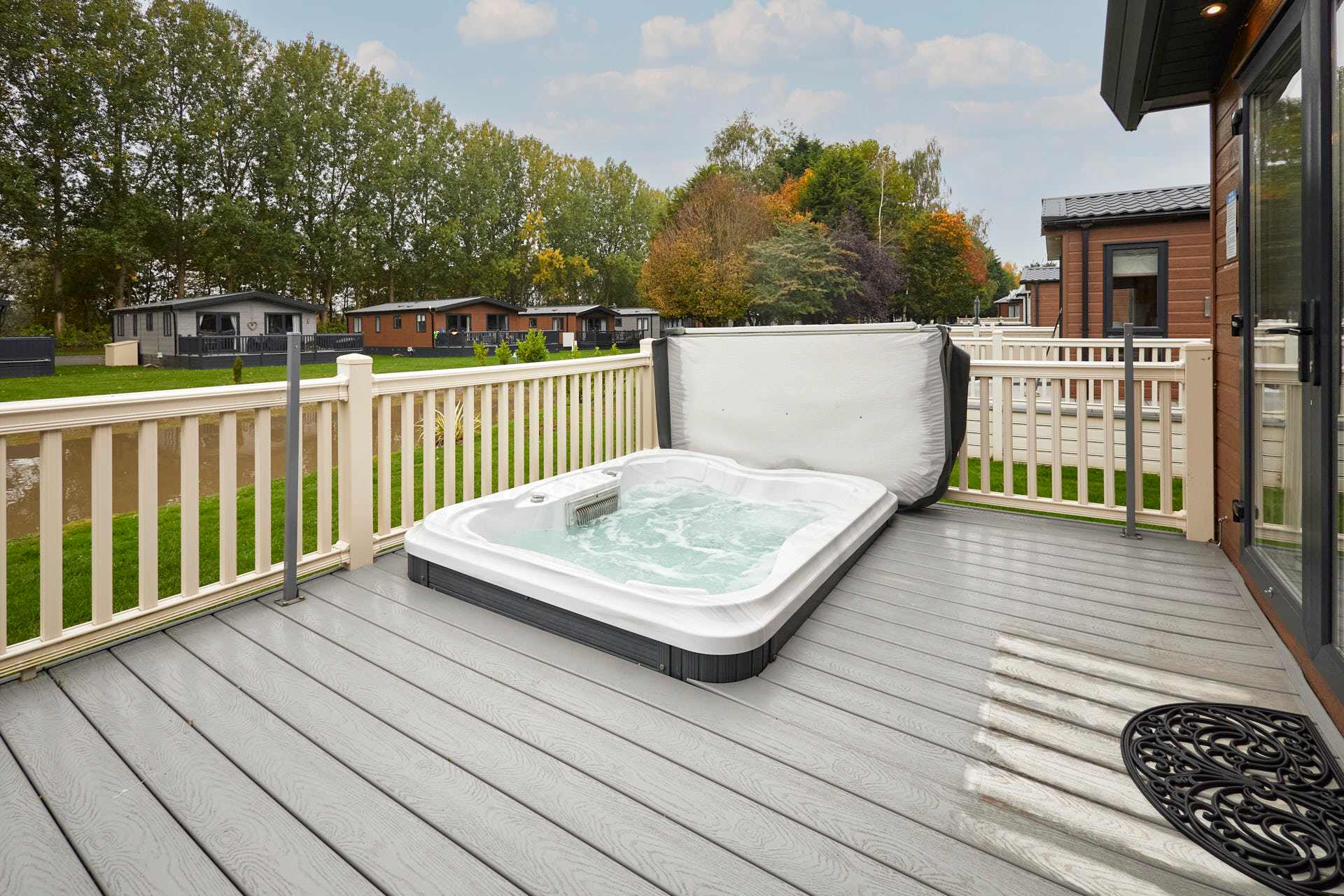 Welcome to Water’s Edge Lodge, a beautifully presented two-bedroom retreat set right beside the tranquil lakeside at Allerthorpe Golf & Country Park. Perfect for peaceful escapes, this lodge sleeps up to four guests, featuring a serene double bedroom and a cosy twin room, along with two modern bathrooms, one with a relaxing bathtub for long soaks after a day outdoors. The open-plan living area is warm, stylish, and thoughtfully furnished, with soft tones and natural textures that create a calming atmosphere. Enjoy slow mornings with coffee at the dining table, unwind by the cosy lounge seating, and prepare home-cooked meals in the fully equipped kitchen, complete with everything you need for a relaxed stay. Step outside onto the large private terrace, where you can take in serene lake views and enjoy true relaxation from your own private hot tub. From sunrise reflections over the water to peaceful evenings under the stars, this scenic outdoor space is a highlight of the stay. With its quiet setting, comfortable interiors, and idyllic lakeside position, Water’s Edge Lodge offers an inviting retreat where you can switch off, slow down, and enjoy nature right on your doorstep. A perfect place to restore and reconnect in calm surroundings.