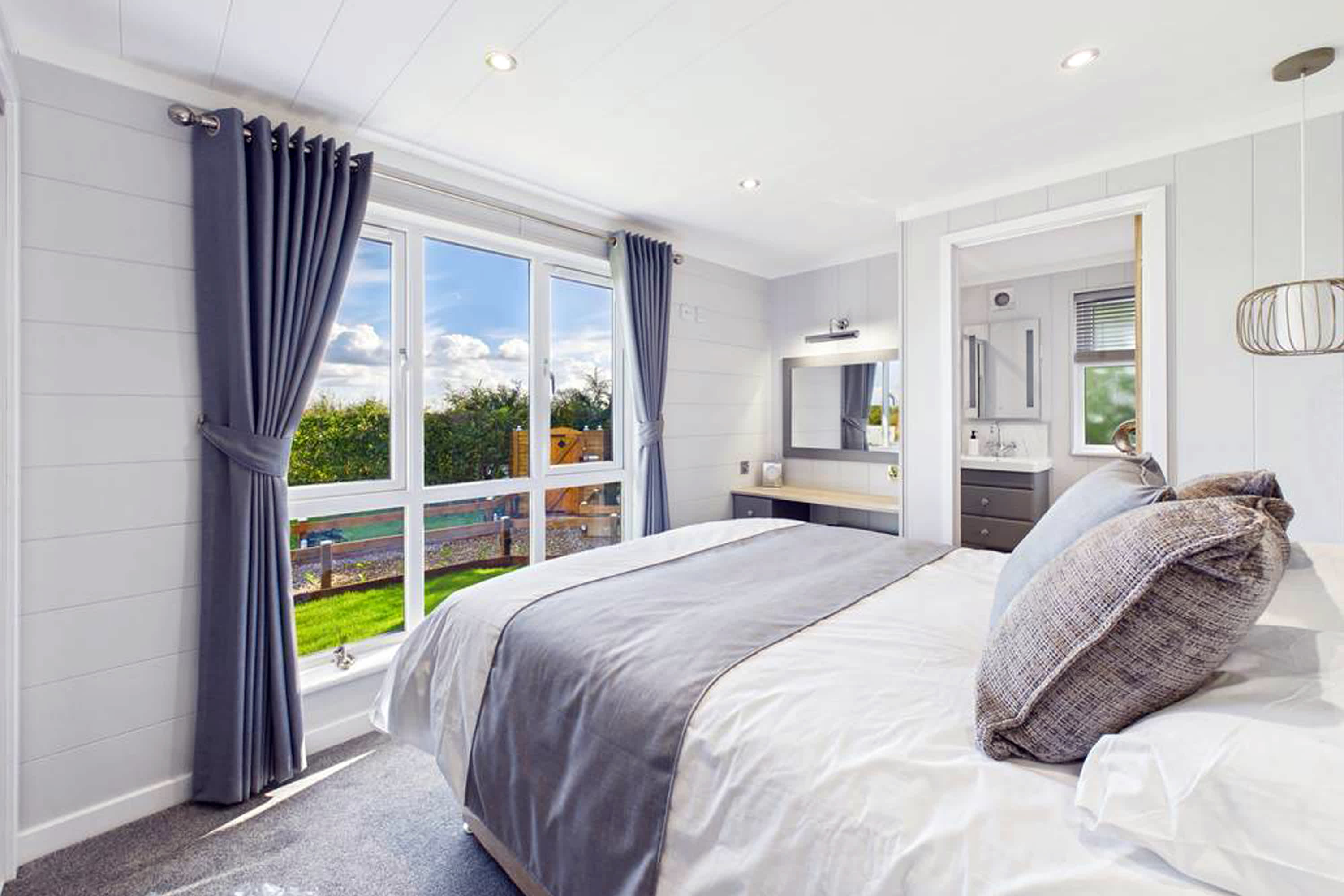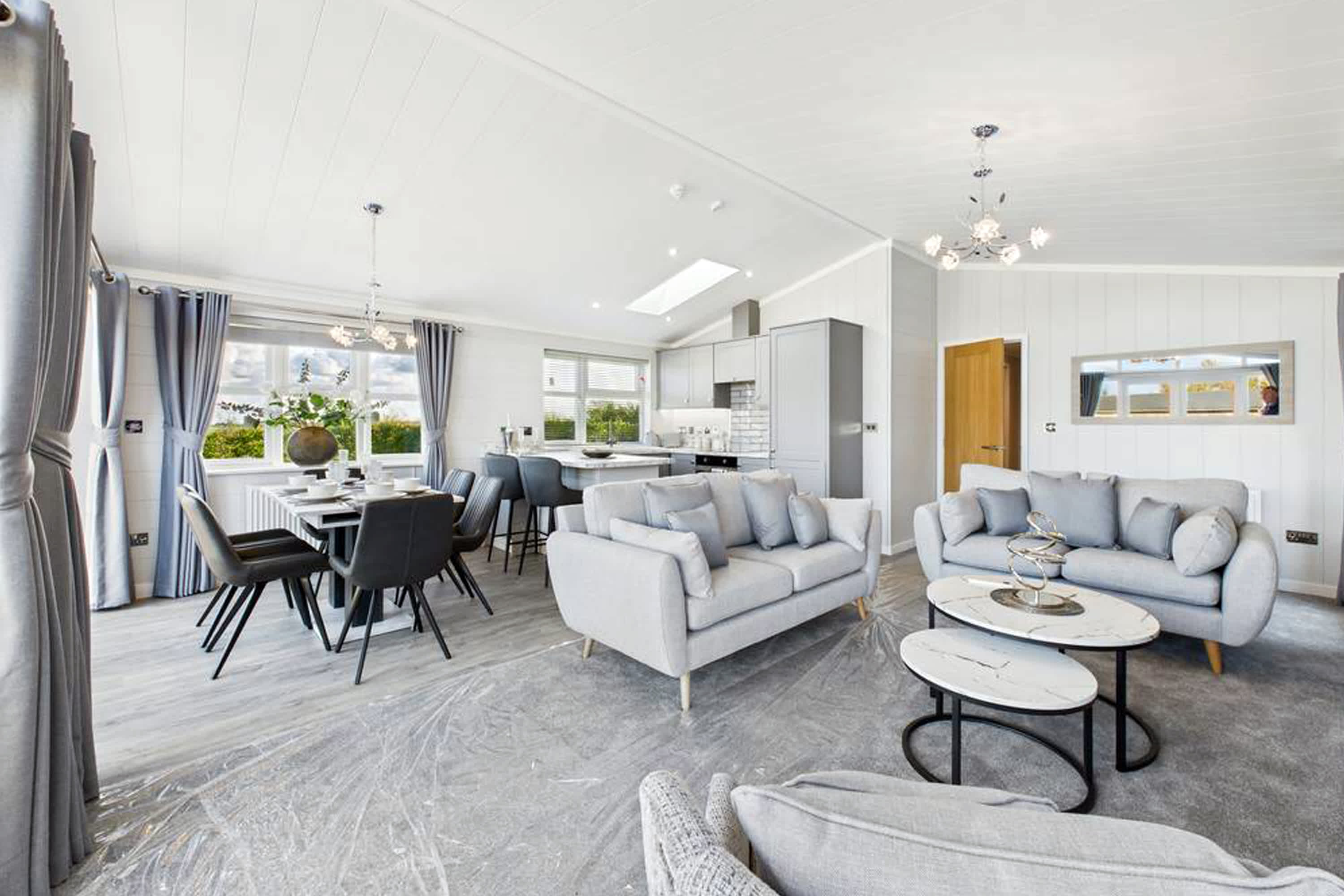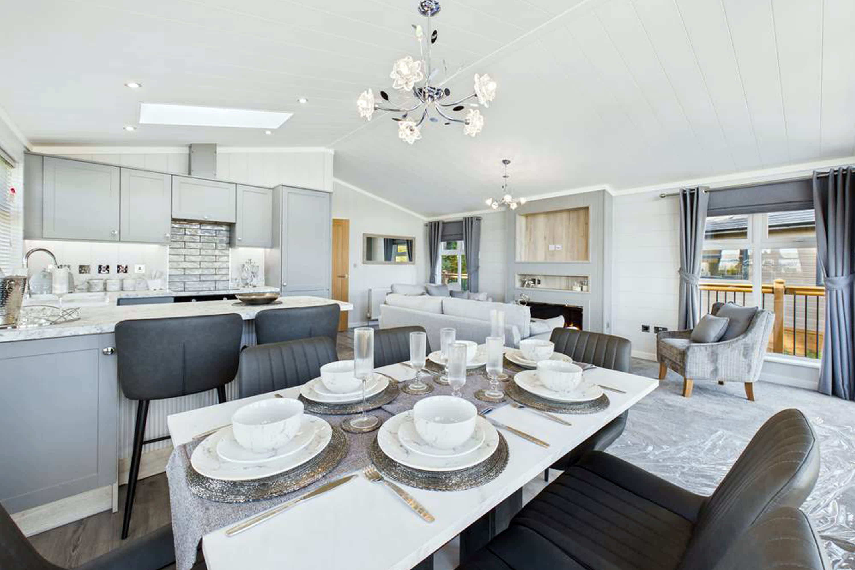 This stunning and modern luxury lodge offers a beautifully designed space that perfectly blends comfort, style, and relaxation. Thoughtfully finished throughout, the lodge provides a peaceful retreat surrounded by scenic lodge park views and countryside beyond. At the heart of the lodge is the spacious open-plan living, kitchen, and dining area, creating a welcoming and sociable environment. The living room features plush grey sofas with ample seating, ideal for unwinding after a day exploring. These face a delightful fire surround, creating a cosy focal point, while large windows framed with luxurious curtains add an elegant touch and invite in plenty of natural light. The dining area provides generous seating, perfect for enjoying meals together, and flows seamlessly into the stunning modern kitchen. Designed with both style and practicality in mind, the kitchen features a skylight, stylish cabinets, a breakfast bar, and all the appliances needed for comfortable self-catering. Large floor-to-ceiling windows allow natural light to flood the room while offering scenic views across the lodge park and surrounding countryside. The master bedroom is a tranquil and spacious retreat, offering a large king-size bed, full-length windows, a dressing area, and convenient access to a modern En-Suite. Two further bedrooms each feature two single beds, with one of the rooms offering the flexibility to be converted into a king-size bed if required. Both rooms include large windows with open outlook views and wardrobe space for storage. The lodge also benefits from a stunning and modern family bathroom, complete with both a bath and separate shower, finished to a high contemporary standard. Externally, the property features a private balcony, beautifully complemented with flowers and comfortable garden furniture. It’s the perfect place to enjoy morning coffee while taking in the fresh countryside air or to relax and watch the sunset in the peaceful surroundings.