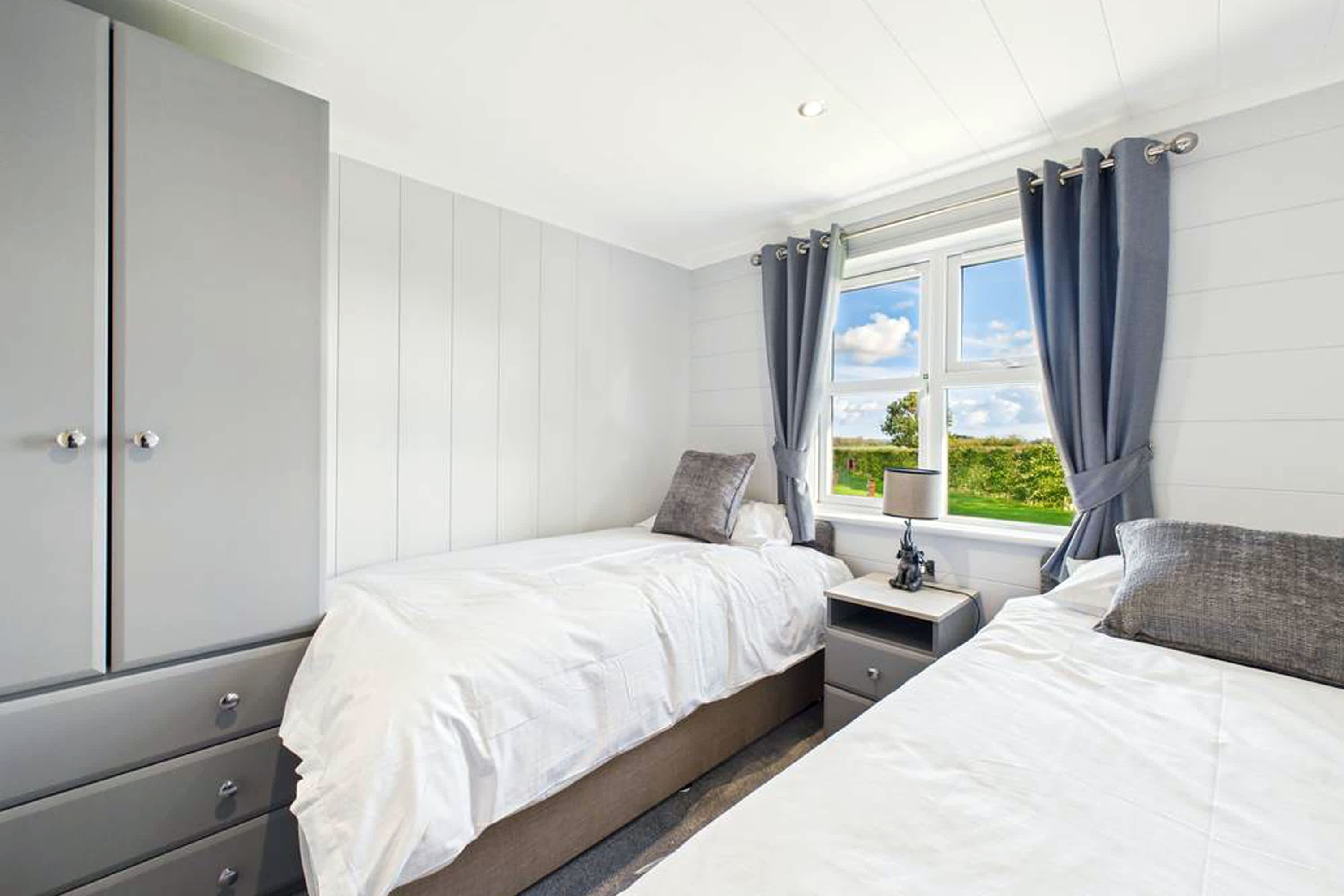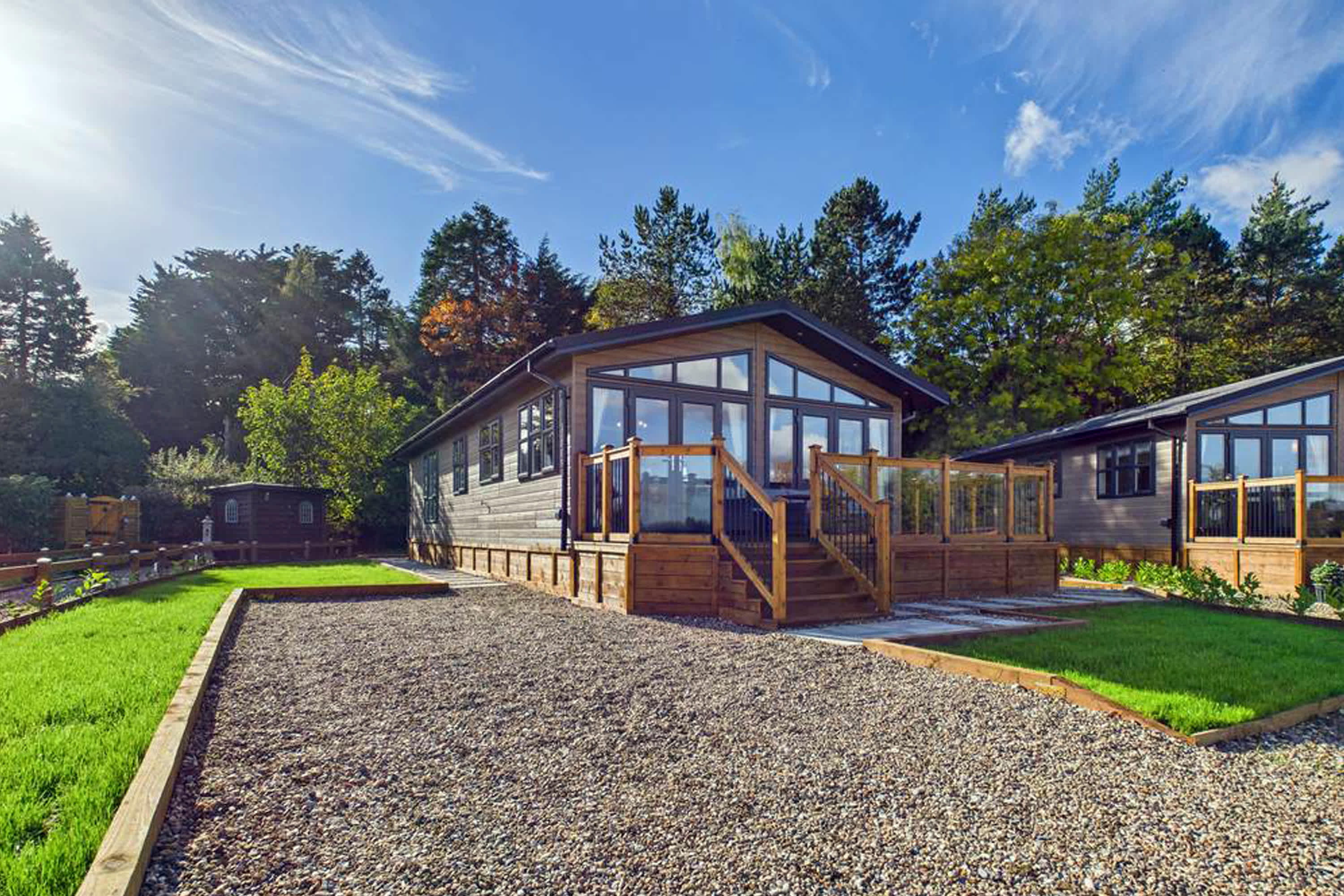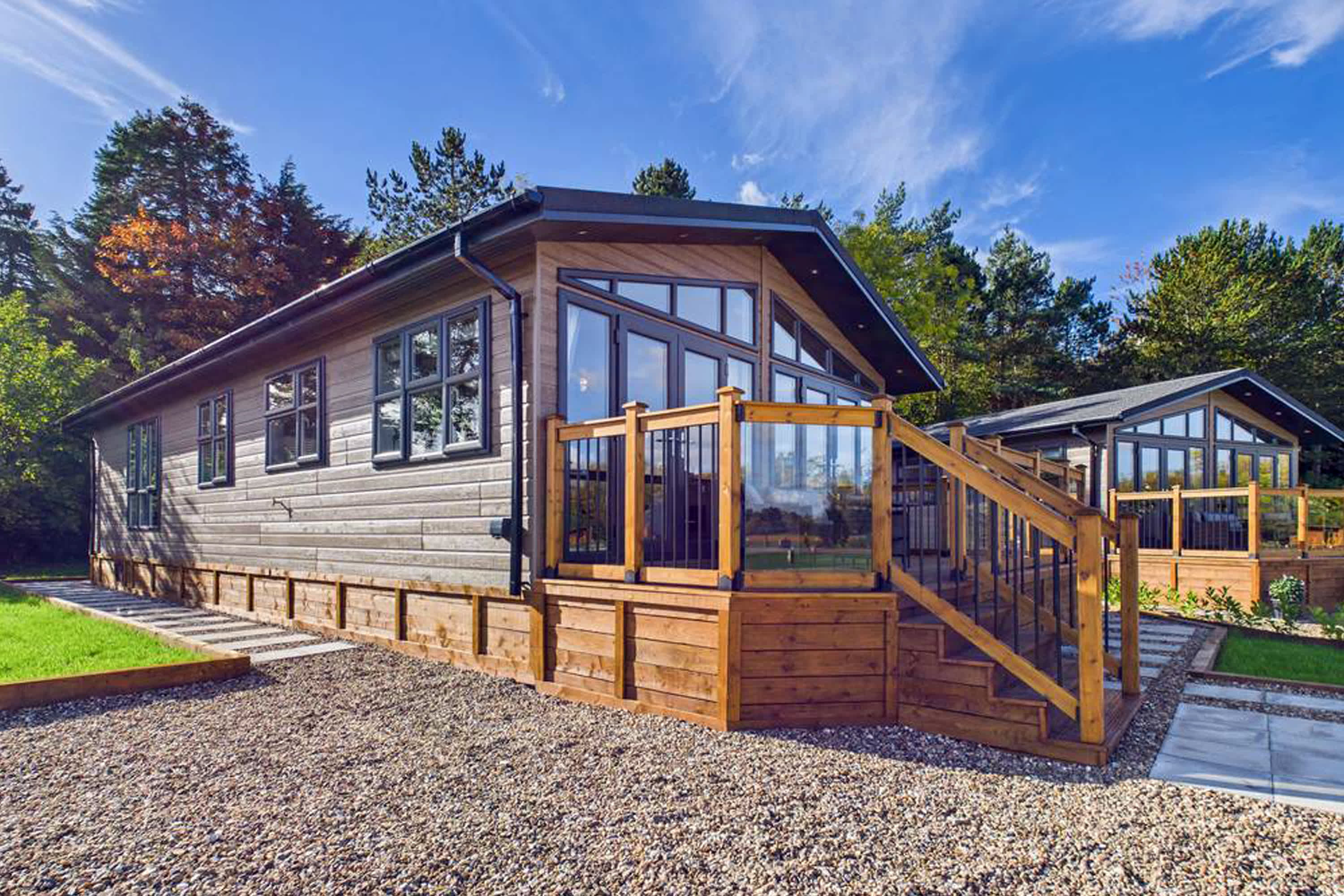 This stunning and modern luxury lodge offers a beautifully designed space that perfectly blends comfort, style, and relaxation. Thoughtfully finished throughout, the lodge provides a peaceful retreat surrounded by scenic lodge park views and countryside beyond. At the heart of the lodge is the spacious open-plan living, kitchen, and dining area, creating a welcoming and sociable environment. The living room features plush grey sofas with ample seating, ideal for unwinding after a day exploring. These face a delightful fire surround, creating a cosy focal point, while large windows framed with luxurious curtains add an elegant touch and invite in plenty of natural light. The dining area provides generous seating, perfect for enjoying meals together, and flows seamlessly into the stunning modern kitchen. Designed with both style and practicality in mind, the kitchen features a skylight, stylish cabinets, a breakfast bar, and all the appliances needed for comfortable self-catering. Large floor-to-ceiling windows allow natural light to flood the room while offering scenic views across the lodge park and surrounding countryside. The master bedroom is a tranquil and spacious retreat, offering a large king-size bed, full-length windows, a dressing area, and convenient access to a modern En-Suite. Two further bedrooms each feature two single beds, with one of the rooms offering the flexibility to be converted into a king-size bed if required. Both rooms include large windows with open outlook views and wardrobe space for storage. The lodge also benefits from a stunning and modern family bathroom, complete with both a bath and separate shower, finished to a high contemporary standard. Externally, the property features a private balcony, beautifully complemented with flowers and comfortable garden furniture. It’s the perfect place to enjoy morning coffee while taking in the fresh countryside air or to relax and watch the sunset in the peaceful surroundings.