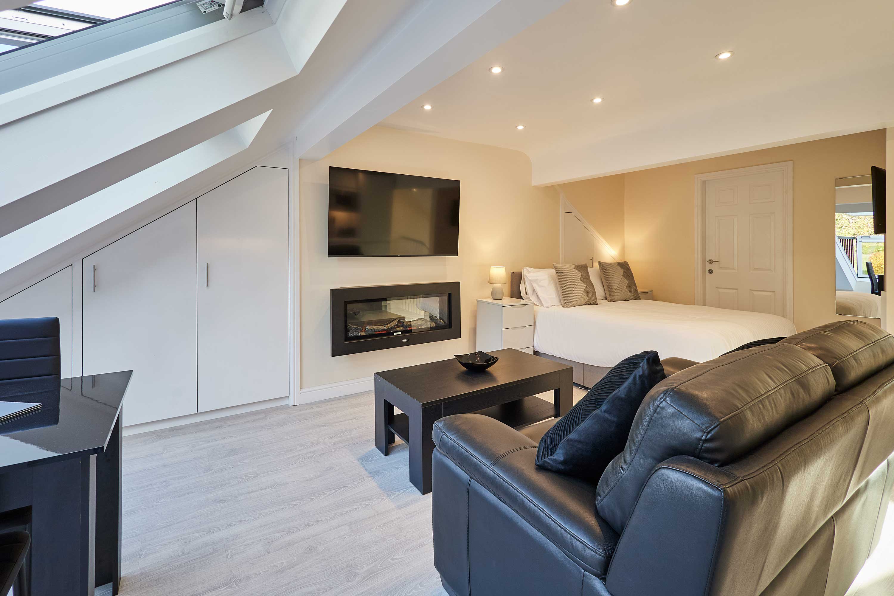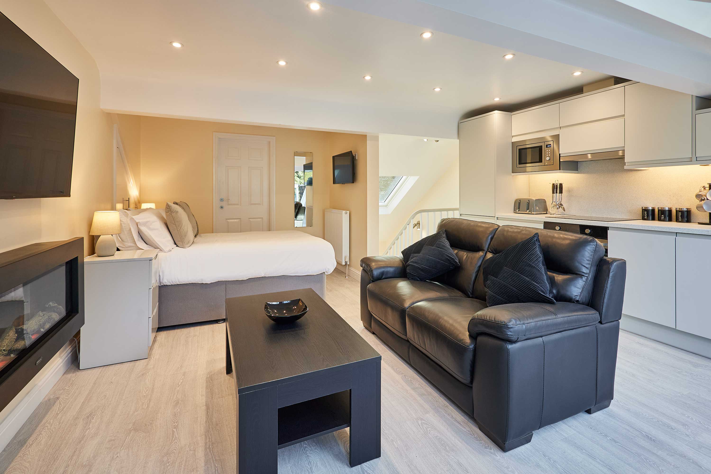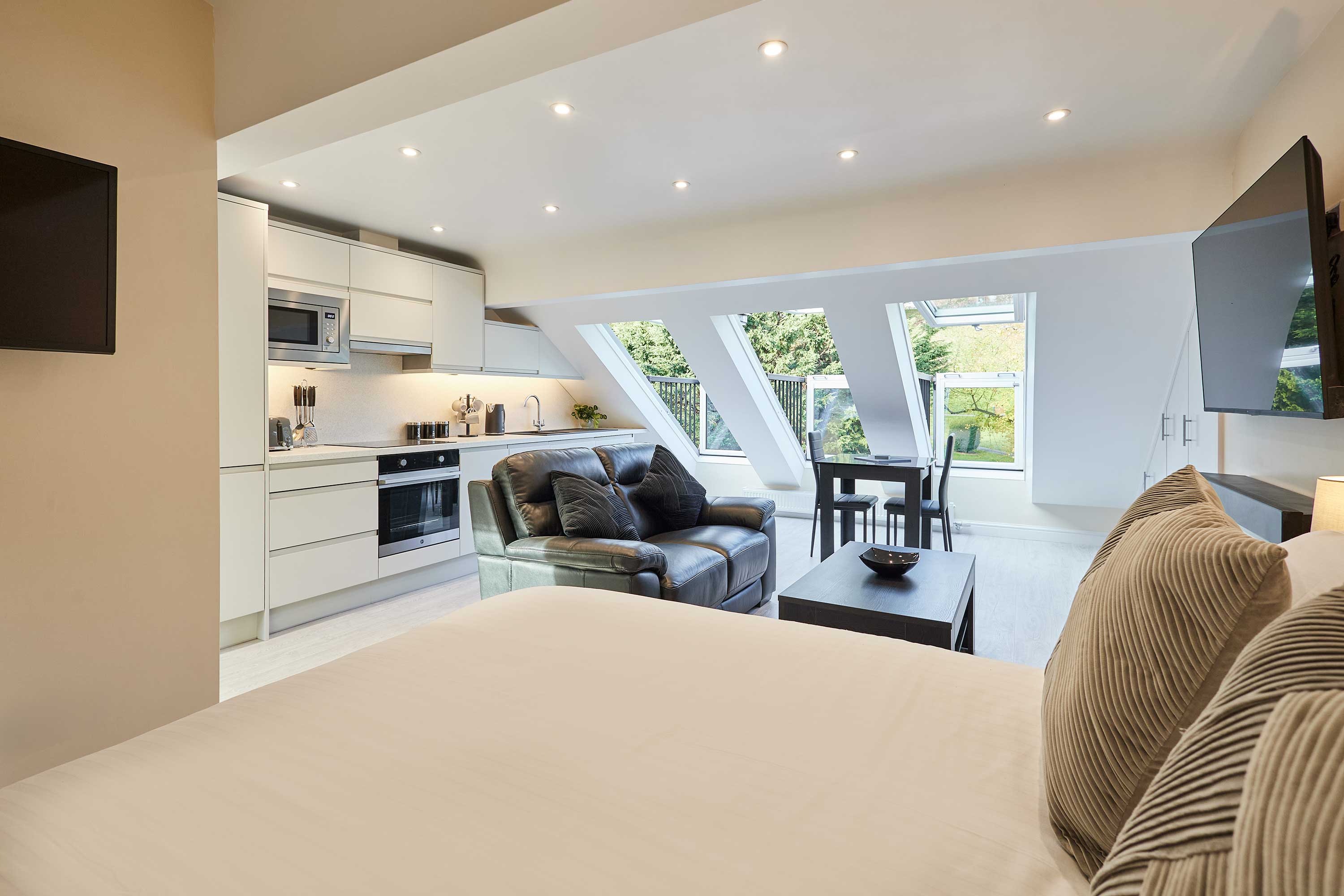 Discover contemporary charm and cosy elegance at Ross’ View, Attic, Apartment 5, a beautifully appointed third-floor retreat in the heart of Whitby. With modern interiors, high ceilings, and peaceful park views, this holiday home offers a relaxing space to unwind and recharge. Step into the open-plan living and sleeping area, where style meets comfort. The space features a plush leather sofa that invites you to relax with a book or watch your favourite shows on the flat-screen TV, while a comfortable double bed sits nearby, surrounded by soft furnishings and crisp white ceilings. Contemporary spotlights and sleek white bedside tables add subtle touches of elegance, creating a space that’s both practical and visually appealing. The modern light grey kitchen is integrated seamlessly into the studio, equipped with high-quality appliances and everything you need to prepare a delicious meal. Enjoy your breakfast or evening dinner at the wooden dining table, or open the sloped windows to let in a gentle summer breeze while you dine. The bathroom is designed with style in mind, featuring marble-effect tiles, sleek silver fixtures, a walk-in shower, and a glossy grey vanity cabinet. It’s a fresh, contemporary space to refresh after a day of exploring. Whether you’re here for a relaxing weekend or a longer stay, Ross’ View, Attic, Apartment 5 offers a perfect blend of modern comfort, thoughtful design, and a peaceful location overlooking Pannett Park - a stylish home away from home in Whitby.