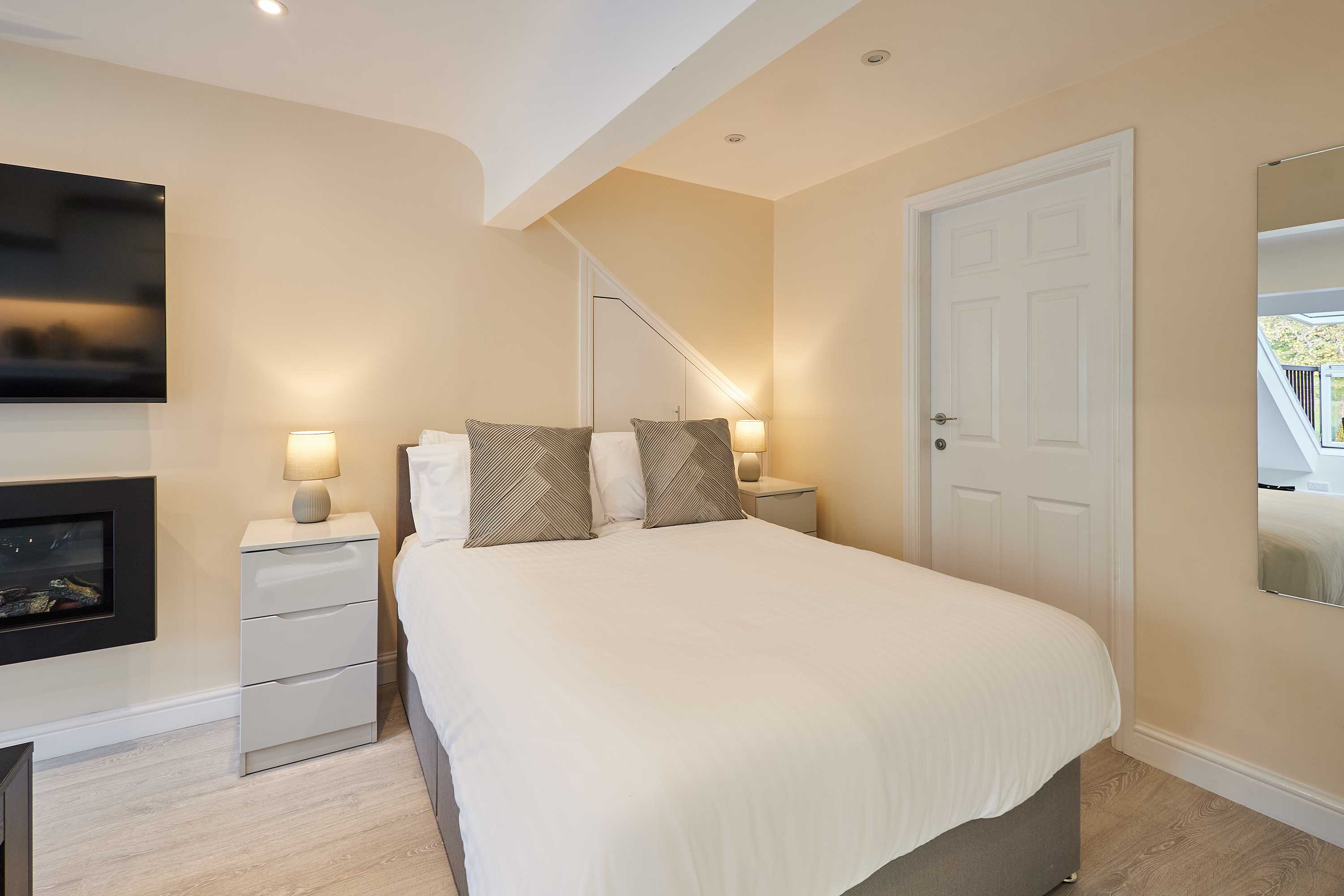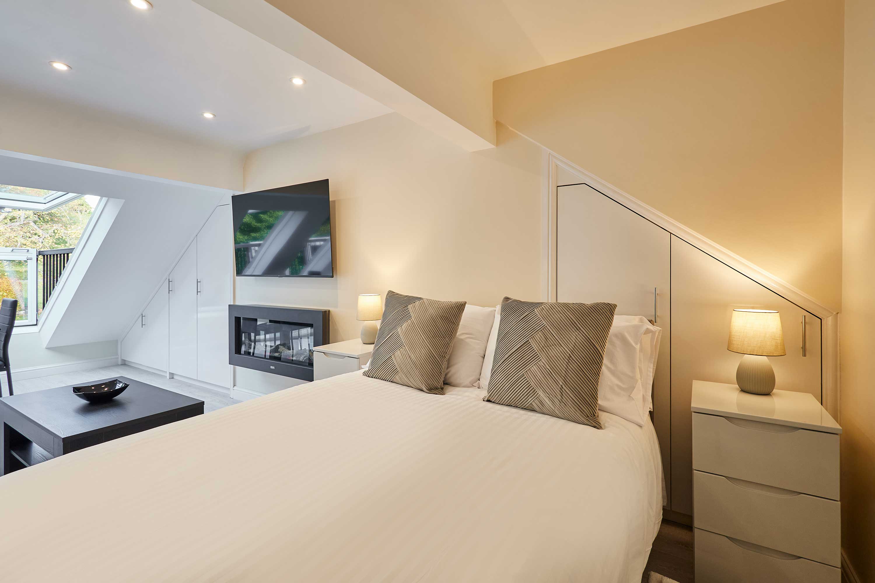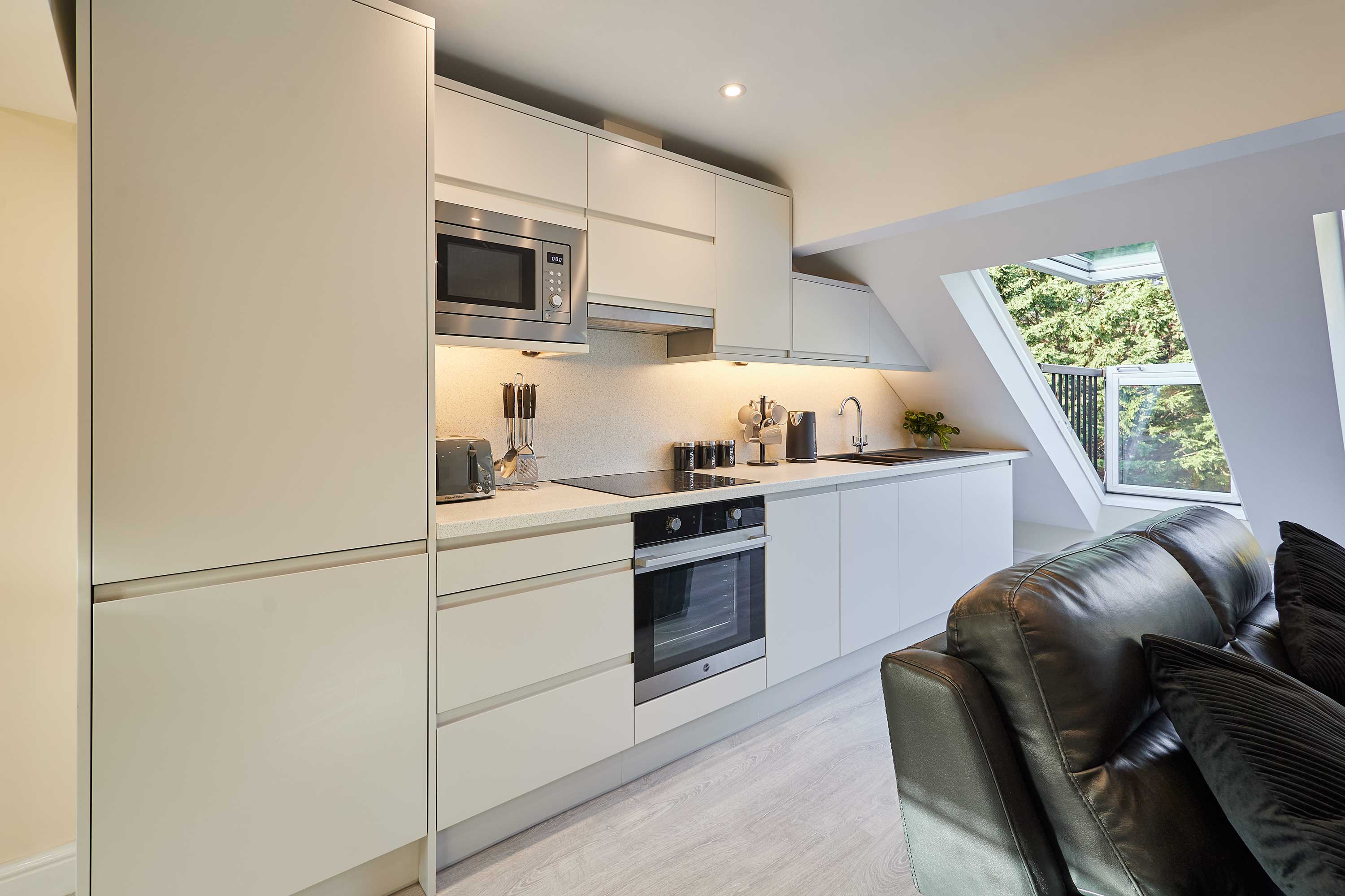 Discover contemporary charm and cosy elegance at Ross’ View, Attic, Apartment 5, a beautifully appointed third-floor retreat in the heart of Whitby. With modern interiors, high ceilings, and peaceful park views, this holiday home offers a relaxing space to unwind and recharge. Step into the open-plan living and sleeping area, where style meets comfort. The space features a plush leather sofa that invites you to relax with a book or watch your favourite shows on the flat-screen TV, while a comfortable double bed sits nearby, surrounded by soft furnishings and crisp white ceilings. Contemporary spotlights and sleek white bedside tables add subtle touches of elegance, creating a space that’s both practical and visually appealing. The modern light grey kitchen is integrated seamlessly into the studio, equipped with high-quality appliances and everything you need to prepare a delicious meal. Enjoy your breakfast or evening dinner at the wooden dining table, or open the sloped windows to let in a gentle summer breeze while you dine. The bathroom is designed with style in mind, featuring marble-effect tiles, sleek silver fixtures, a walk-in shower, and a glossy grey vanity cabinet. It’s a fresh, contemporary space to refresh after a day of exploring. Whether you’re here for a relaxing weekend or a longer stay, Ross’ View, Attic, Apartment 5 offers a perfect blend of modern comfort, thoughtful design, and a peaceful location overlooking Pannett Park - a stylish home away from home in Whitby.